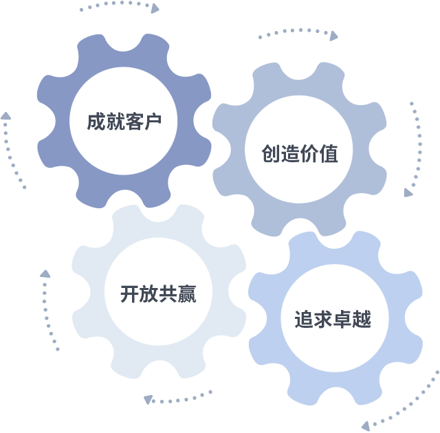 成就客户是一切决策的出发点,创造价值是衡量所有工作的标准,追求卓越是征途国际做事做人的态度,开放共赢是征途国际的格局也是最终的结果。价值观的齿轮环环相扣,推动着组织里的每个人不断向前。